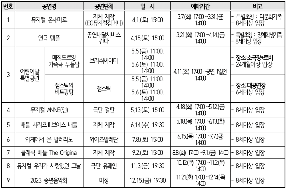 또한, 5월에는 가족과 함께 보기 좋은 극단 걸판의 ▲<뮤지컬 앤>, 6월에는 목소리의 감동을 선사하는 자체제작공연 ▲<보이스 배틀>, 7월에는 와이즈발레단의 ▲<넌버벌 댄스컬 외계에서 온 발레리노> 등 다양한 장르의 공연이 펼쳐진다.
