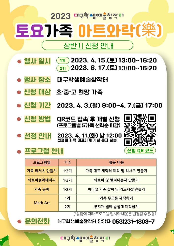 대구학생예술창작터는 부모와 자녀가 함께 소통하며 체험하는 가족 단위 예술융합 체험 프로그램인 ‘토요가족 아트와락(樂)’을 4월 15일(토)과 6월 17일(토) 2회에 걸쳐 운영한다.