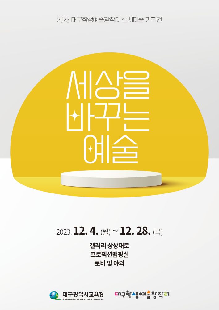대구시교육청은 학생들의 체험과 경험을 바탕으로 제작한 다채로운 주제의 설치미술 작품들을 학생, 학부모 및 지역사회와 함께 공유하기 위해 오는 12월 28일(목)까지 대구학생예술창작터 실내ㆍ외 전시공간에서 ‘2023. 대구학생예술창작터 설치미술 기획전’을 개최한다.