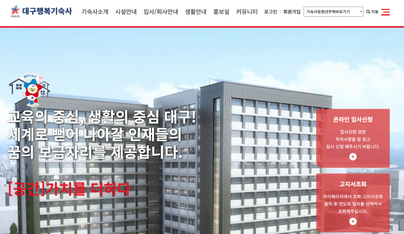 대구행복기숙사는 503실, 1,000명이 입주 가능한 규모로 지난 3월 개관해 운영 중이다. 기숙사비는 관리비를 포함해 월 24만 원으로 최대 8년까지 이용할 수 있다. 대학의 추천을 받아 입주하는 경우에는 월 19만 원대 수준으로 이용 가능하다.