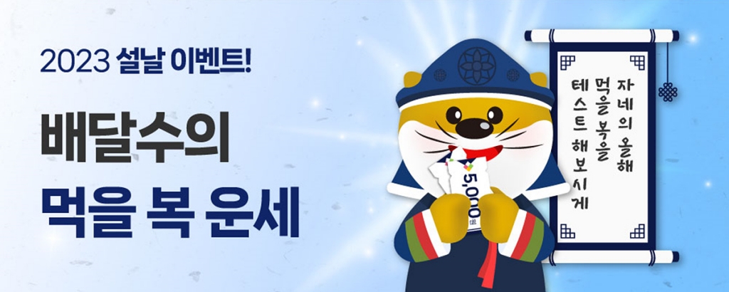 대구형 배달앱 ‘대구로’는 다가오는 설을 맞이해, 1. 20.(금) ~ 1. 24.(화)까지 ‘배달수의 먹을 福’ 설 이벤트를 진행한다. 이번 이벤트는 ‘대구로’ 회원 전체를 대상으로 진행되며, 참여시 신년 먹을 복 운세 메시지와 함께, 1,000원, 2,000원, 3,000원, 5,000원 4종 대구로 쿠폰(1인 1매 제한)을 랜덤으로 지급해 시민들의 풍성한 설을 기원할 예정이다.