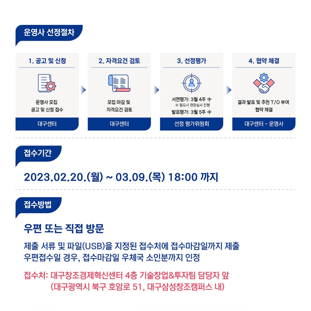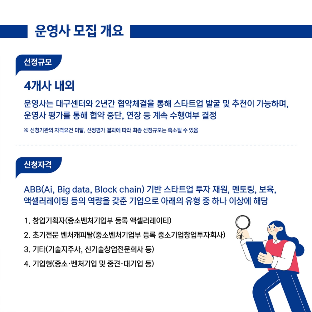 대구센터는 본 사업에서 활동할 민간운영사(액셀러레이터, 투자사 등)를 모집하고 있으며, 대구창업허브(startup.daegu.go.kr) 홈페이지 공고를 통해 신청 자격, 우대사항, 제출서류 등을 확인할 수 있고, 우편 또는 직접 방문을 통해 신청할 수 있다.