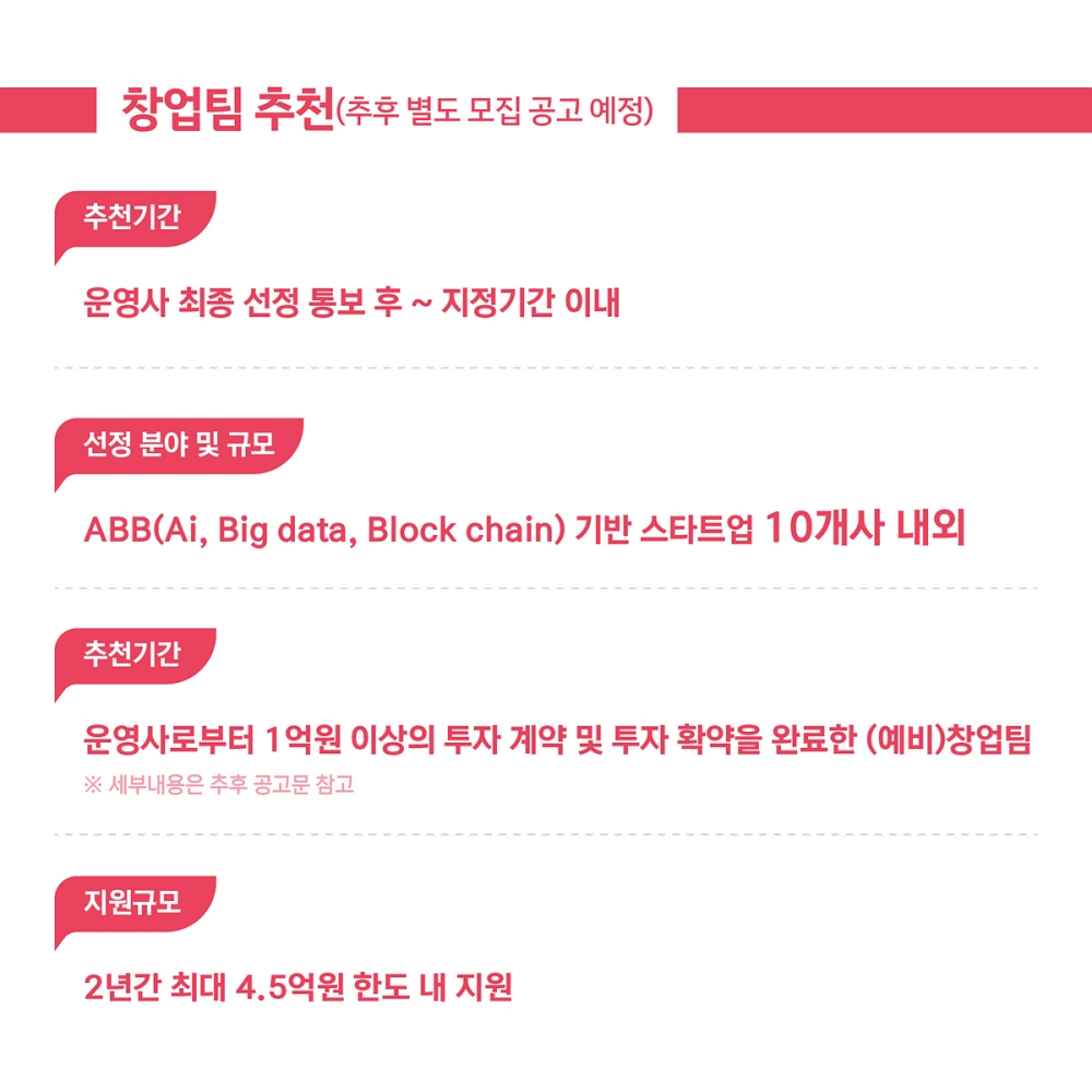 뿐만 아니라, 1:1 맞춤 기업 컨설팅, 밋업데이, IR 데모데이, 글로벌 진출 지원, 한국거래소 KSM 등록 지원 등 기업이 성장할 수 있는 다양한 전문 프로그램들도 함께 지원할 계획이다.