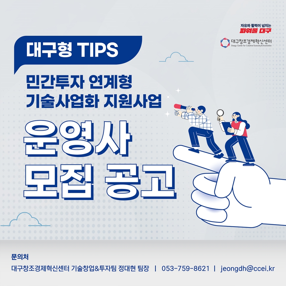 대구시와 (재)대구창조경제혁신센터(이하 대구센터)는 2월 20일(월)부터 3월 9일(목)까지 ‘대구광역시 민간투자 연계형 기술사업화 지원사업’을 추진하기 위한 민간 운영사를 모집한다.