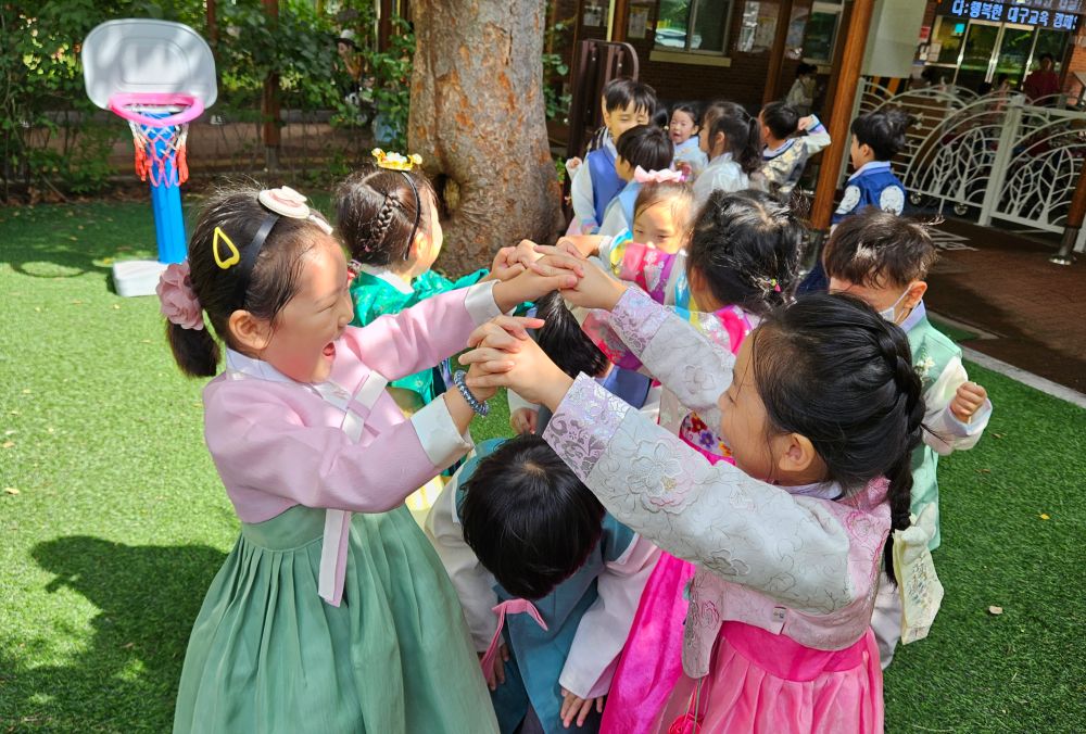 이번 행사에서는 ‘한복 입는 날’을 정해 학급별로 곱게 한복을 차려입고 전통놀이를 체험한 뒤, 9월 21일(화)‘전통놀이 한마당’을 실시해 전체 유아들이 함께 버나놀이·짚고리 던지기·죽마놀이·망깨놀이·투호놀이·딱지치기·사방치기 등 다양한 전통놀이를 경험했다. 또, 9월 26일(화)에는 꽃잎반·열매반을 대상으로 떡메치기와 인절미 만들기 체험을 실시한다.