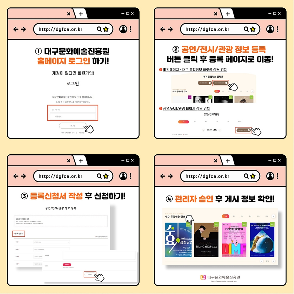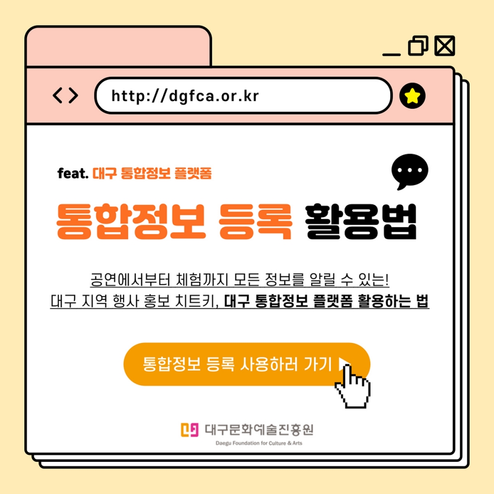 플랫폼은 대구문화예술진흥원 기존 홈페이지에 구축돼 신규 홈페이지 개발 시 소요되는 예산을 절감하면서 날짜별/지역별/키워드별 통합정보 검색, 통합정보 등록 등 실효적 기능을 탑재했다. 홈페이지를 방문하는 플랫폼 사용자는 대구지역 내에서 이루어지는 모든 공연, 전시, 행사, 교육, 체험 일정을 주최/주관에 상관없이 등록 신청이 가능하며 신청된 일정은 관리자 승인 후 게시된다.