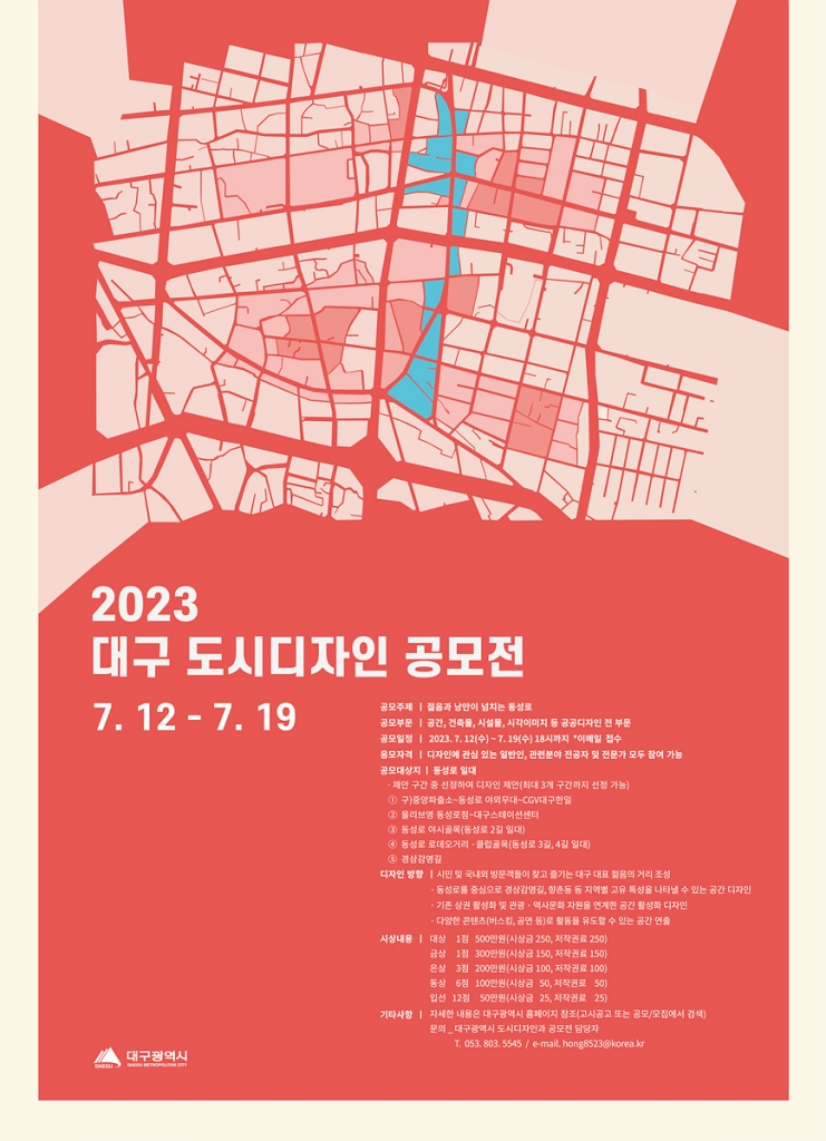 대구광역시는 ‘젊음과 낭만이 넘치는 동성로’를 주제로 ‘2023 대구 도시디자인 공모전’을 개최한다.