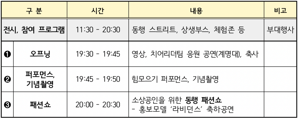 중소벤처기업부와 대구광역시가 함께하는 동성로 특별행사는 9월 4일 동성로 야외무대(동성로 28 아트스퀘어)를 중심으로 ▲상생부스, 동행스트리트, 대구특별존, 체험존으로 운영되며, 저녁 7시 30분 메인행사로 ▲소상공인 응원공연, 동행축제 힘모으기 퍼포먼스, 대구 소상공인을 위한 동행 패션쇼 등이 열릴 예정이다.