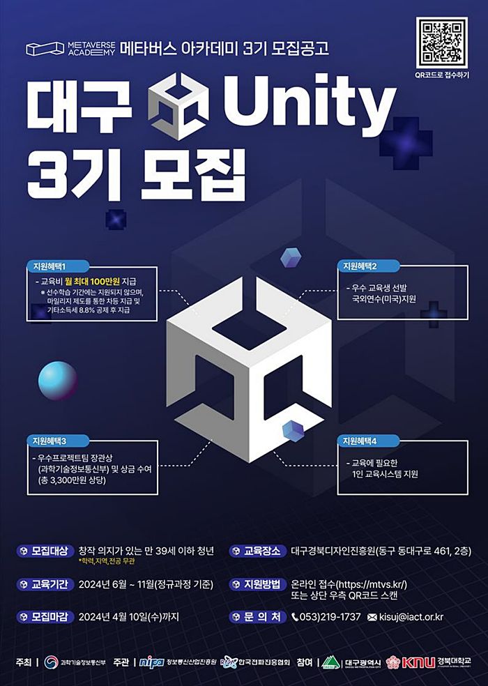대구광역시와 경북대학교는 메타버스* 분야에서 창작 의지와 열정을 가진 청년들이 미래의 메타버스 산업을 이끌 전문가로 성장할 수 있도록 지원하는 ‘대구 메타버스 아카데미’ 3기 교육생을 4월 10일(수)까지 공개 모집한다.