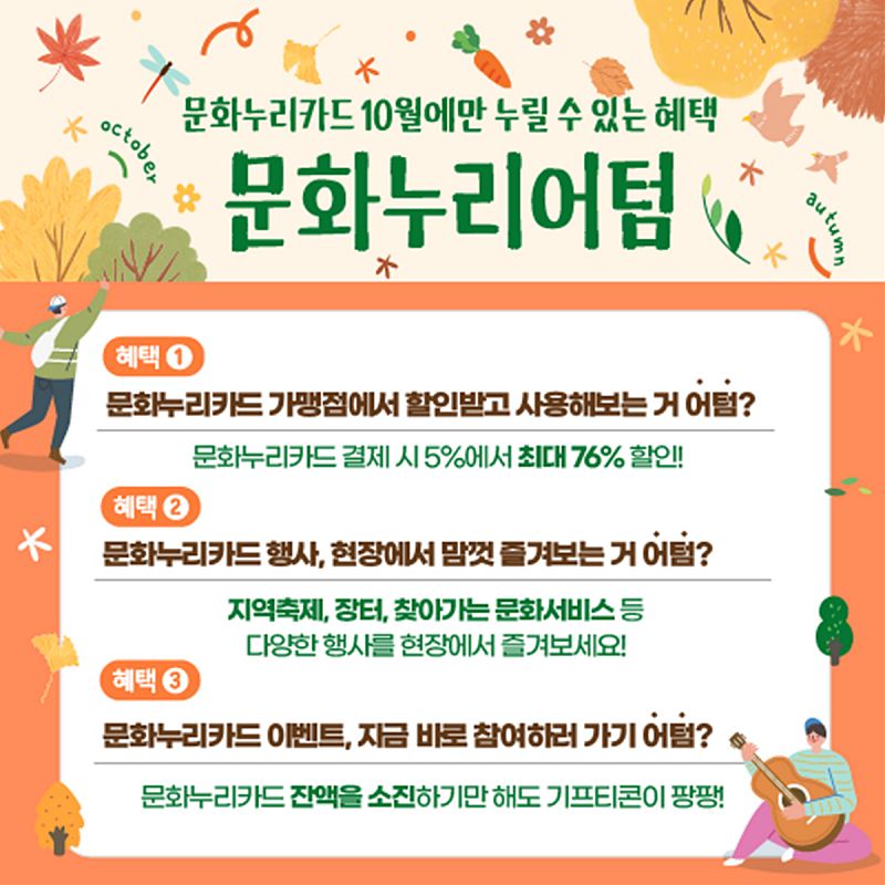 2023년 문화누리어텀이 운영되는 10월 한 달간, 문화누리카드 블로그 등을 통해 이용자가 풍성한 혜택을 누릴 수 있도록 전국에 분포한 가맹점의 특별 할인을 제공하고, 각종 행사와 이벤트 소식을 전달한다.