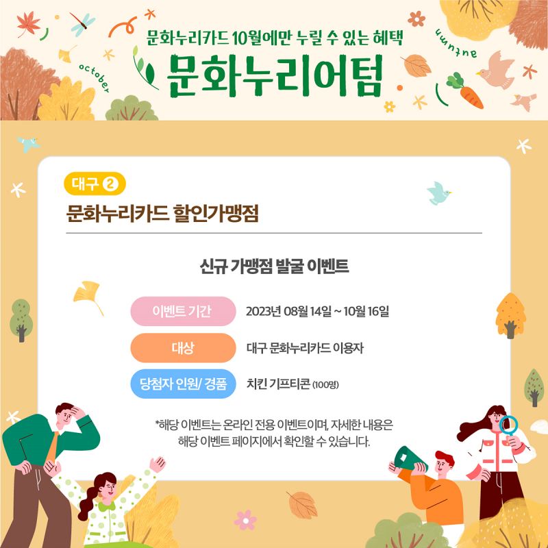 다양한 할인 혜택에 이어 진흥원은 대구 문화누리카드 이용자를 대상으로 10월 16일(월)까지 신규 가맹점 모집 이벤트를 운영 중이다. 대구에 소재하며 문화누리 가맹점 등록 기준에 부합하나 아직 미등록된 가맹점을 추천할 시 추첨을 통해 치킨 기프티콘을 제공한다. 이벤트 응모는 네이버 폼(https://naver.me/xZG6BwCL)을 통해 참여할 수 있다.
