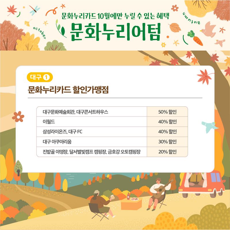 진흥원은 대구 문화누리카드 이용자를 위해 문화누리어텀 기간 동안 다양한 할인가맹점 및 이벤트 등의 혜택을 준비했다. 이월드, 대구 아쿠아리움, 삼성라이온즈 등의 가맹점이 최대 50%에서 20%까지 할인 혜택을 제공한다. 할인 혜택은 문화누리어텀 기간이 지난 후에도 이어지며 이외의 할인가맹점에 대한 정보는 문화누리카드 누리집(www.mnuri.kr)에서 확인할 수 있다.