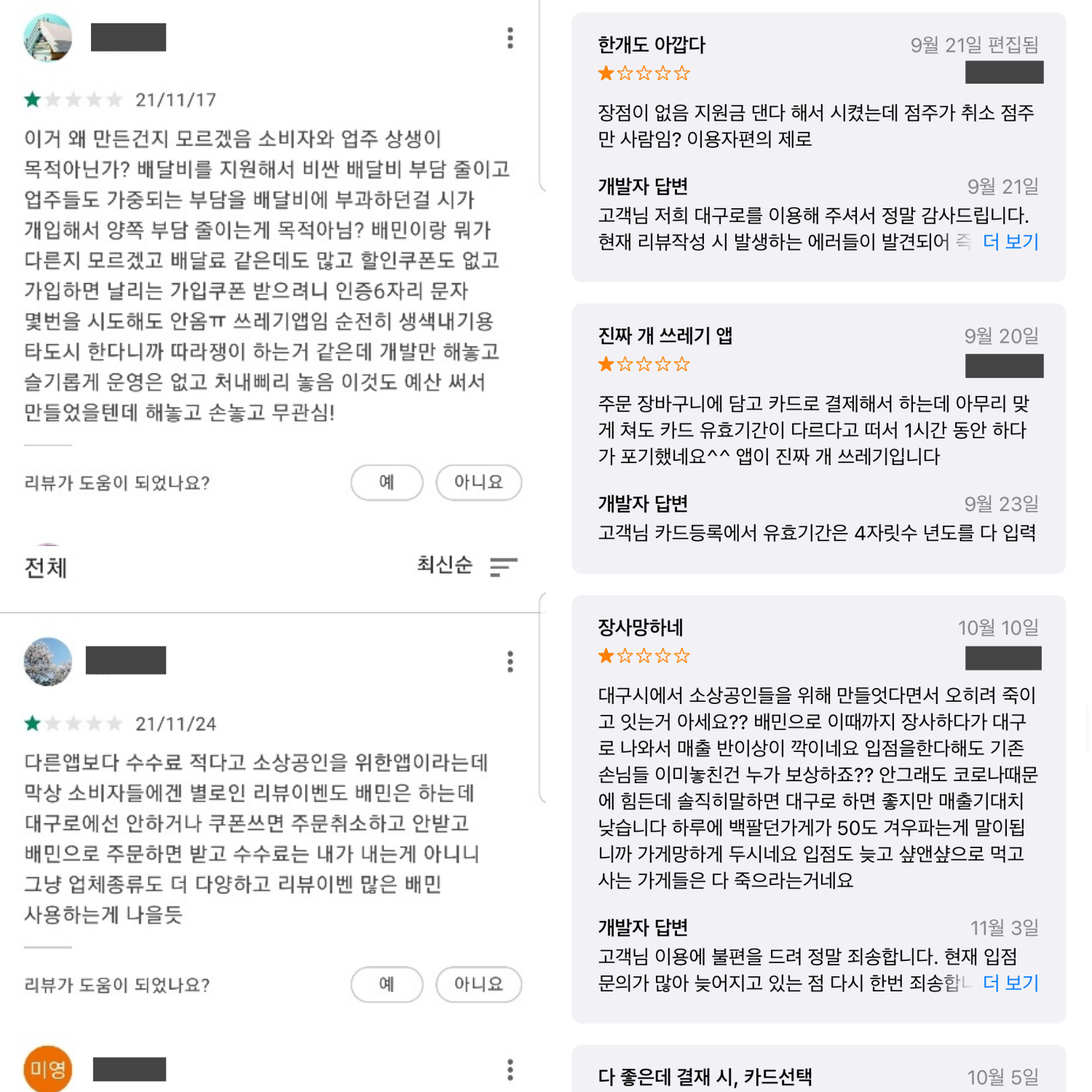 게다가 대구로 앱리뷰를 확인하면 소비자는 물론 점주가 작성한 것으로 보이는 리뷰에도 '소상공인을 위해 만들었다면서도 오히려 죽이고 있다'는 글을 확인할 수 있을 정도로 다양한 불만이 쏟아지고 있는 상황이다.