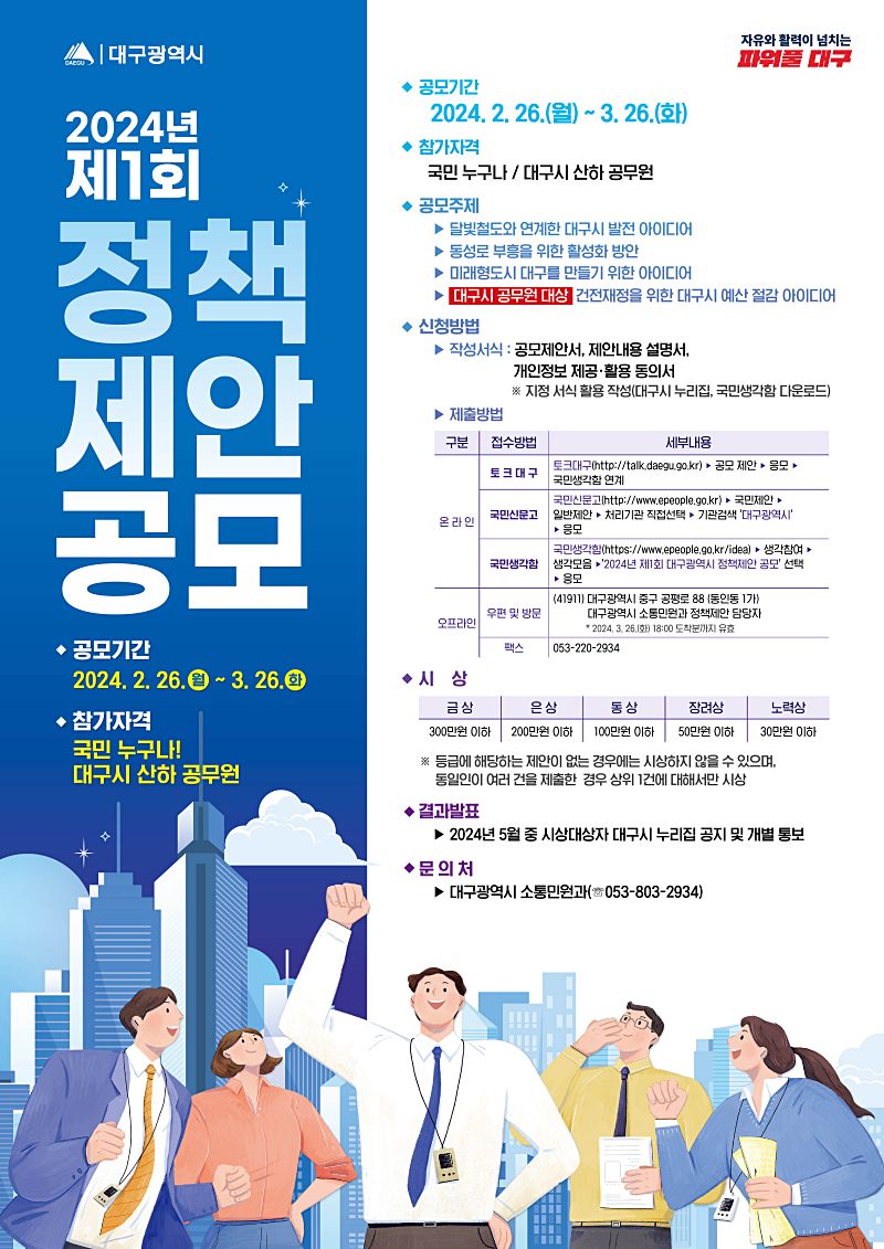 대구광역시는 전 국민 및 대구시 산하 공무원의 창의적인 아이디어를 발굴해 시정에 적극 반영하기 위한 ‘2024년 제1회 정책제안 공모’를 추진한다.