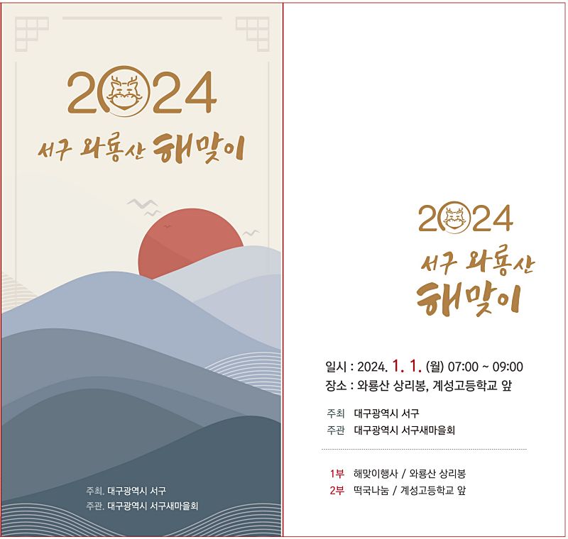 대구 서구가 주최하고 서구새마을회가 주관하는 이번 행사는 오전 7시에 와룡산 상리봉 정상에서 신년 인사, 대북 타고, 일출 감상, 문화공연 등을 통해 새해를 맞이하며, 8시부터는 계성고등학교 앞에서 떡국 나눔과 서구를 대표하는 대구시 무형문화재 제2호 날뫼북춤의 지신밟기, 통기타 공연, 신년 타로점 이벤트 행사가 진행된다.