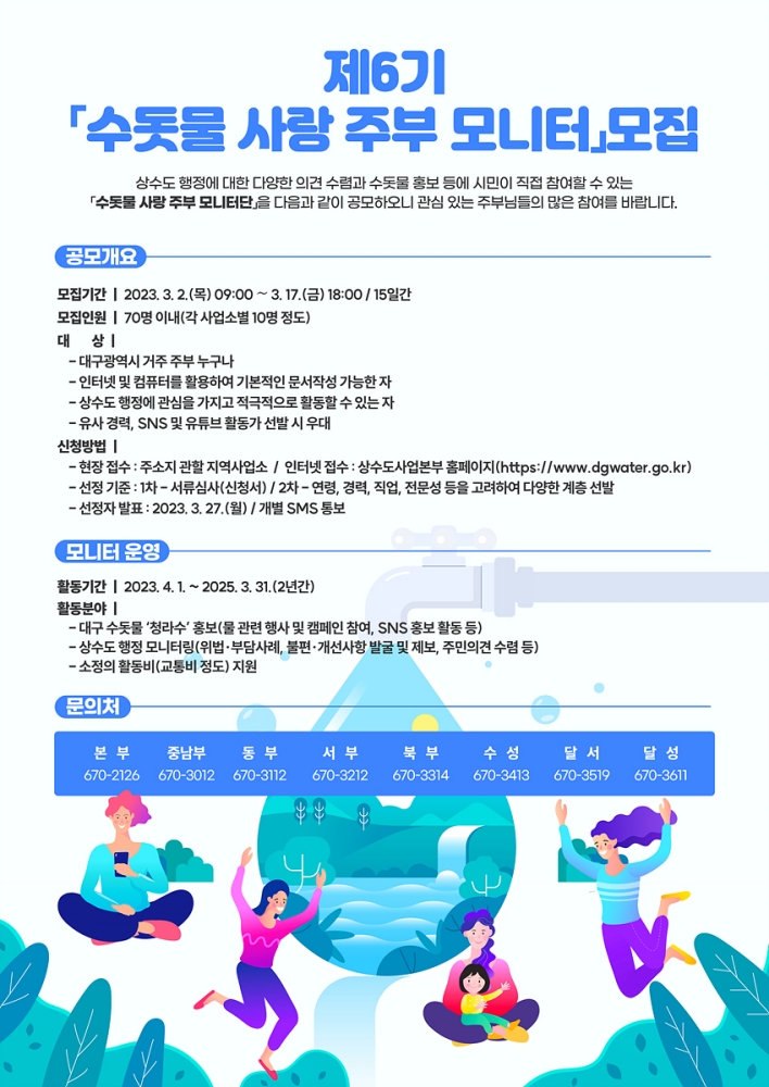 대구시 상수도사업본부는 평소 대구 수돗물에 관심을 가지고 상수도 행정에 참여를 희망하는 대구시 거주 주부를 대상으로 제6기 ‘수돗물 사랑 주부모니터단’ 70명을 모집한다.