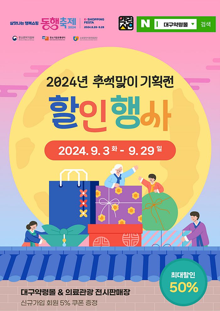 대구광역시는 추석 명절을 맞아 개최되는 ‘2024년 9월 동행축제’ 기간 동안 의료관광 전시판매장(중구 남성로 25, 1층)과 대구 약령몰(www.dghanbang.com)에서 할인행사를 진행한다.