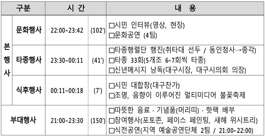 타종식에는 주요 기관·단체장을 비롯하여 올해를 빛낸 자랑스러운 시민들이 33인의 타종인사로 참여하고, 타종 후 홍준표 대구광역시장의 신년사와 시민들과 함께하는 ‘대구찬가’ 합창 및 화려한 불꽃쇼가 펼쳐진다.