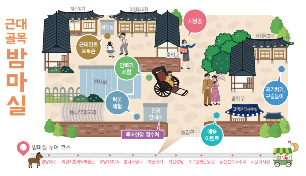 근대골목(2코스) 일대에서 진행되고 있는 밤마실프로그램은 관광객들에게 이상화․서상돈고택, 계산예가, 김원일의 마당깊은 집을 금요일~일요일에 오후 10시까지 개방하고 금·토요일 저녁(7시~9시)에는 밤마실투어를 하면서 다양한 체험거리(음악, 미술, 전통놀이)를 제공하는 프로그램이다.