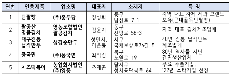 올해 1호로 ‘대구우수식품’으로 선정된 제품은 ㈜홍두당의 단팥빵, 영농조합법인 팔공김치의 팔공산명품김치, 성경순만두의 대구전통 납작만두, ㈜풍국면의 풍국면, 농업회사법인 ㈜영풍의 치즈떡볶이로 5개 업소의 5개 제품으로, 인증기간은 2년이다.