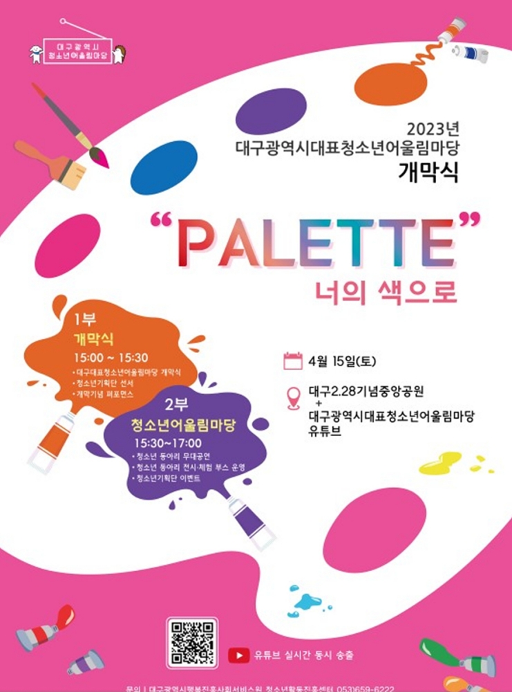 대구광역시가 주최하고 대구청소년활동진흥센터가 주관하는 ‘대표 청소년어울림마당 개막식’이 4월 15일(토) 오후 3시, 2.28기념중앙공원에서 열린다.