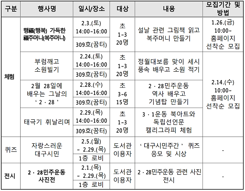 대구2·28기념학생도서관은 설날 및 정월대보름의 세시풍속을 익히고 2·28민주운동 및 3·1운동과 같은 우리나라 역사와 관련된 기념일을 맞이해 민주시민 정신 계승 및 선조들의 독립 정신에 대해 일깨우고자 2월 한 달 동안 다양한 행사를 개최한다.