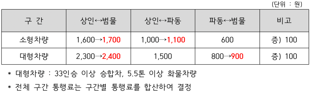 대구시는 소비자물가지수 변동으로 유료도로인 앞산터널로(상인∼범물 간)의 통행료에 대해 인상 요인이 발생함에 따라 올해 4월 1일(토)부터 통행료를 인상할 계획이다.