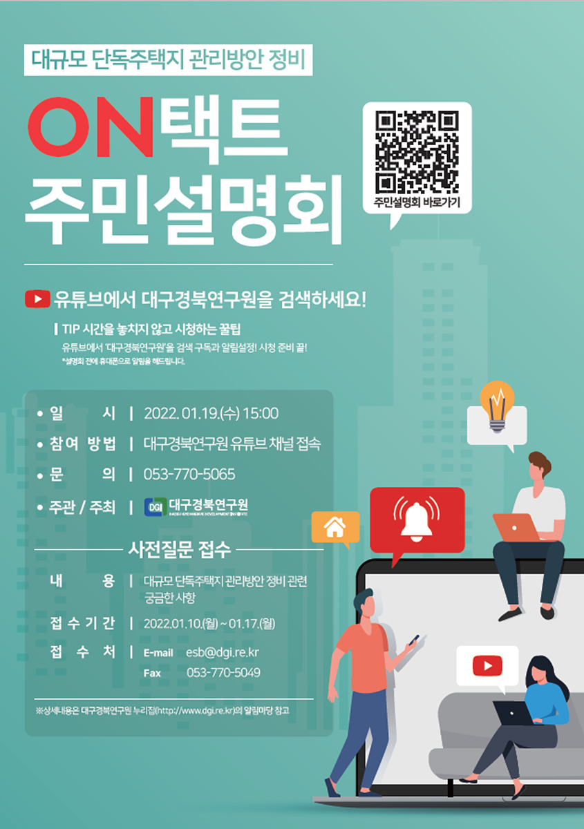 대구경북연구원은 1월 19일(수) 유튜브 채널을 통해 ‘대규모 단독주택지 관리방안’ 연구결과에 대해 온택트 주민설명회를 개최한다.
