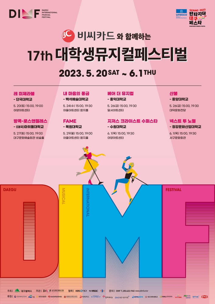 대구국제뮤지컬페스티벌은 지난 2019년부터 대학생뮤지컬페스티벌의 메인 후원사로서 젊은 인재 지원에 힘쓰고 있는 ‘BC카드’와 협력해 제17회 DIMF 어워즈(6. 5. 대구오페라하우스)에서 발표될 대뮤페 수상작에 대한 시상금을 대폭 확대했다.