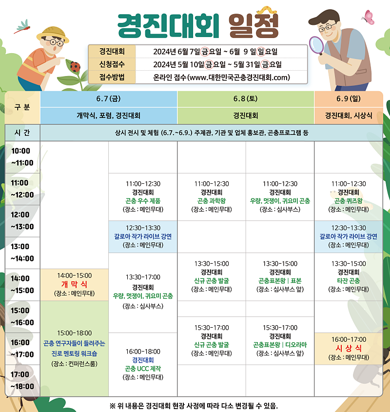 ‘대한민국 곤충경진대회’는 곤충에 대한 인식 개선과 곤충산업 활성화를 위해 2017년 처음 시작된 시민 참여형 축제다. 올해 대회는 ‘소중한 우리 친구, 곤충!’을 주제로 11개 분야 16개 종목으로 진행된다.