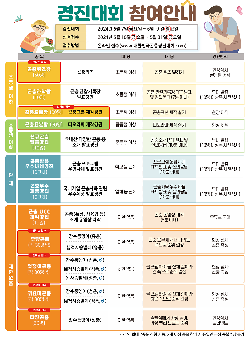 이번 ‘제8회 대한민국 곤충경진대회’는 곤충애호가라면 누구나 참여가능하며 5월 10일(금) 10시부터 31일(금) 17시까지 경진대회 누리집(www.대한민국곤충경진대회.com)에서 신청하면 된다. 참가 신청은 선착순 마감이다. 종목별로 사전 참가 신청을 해야 하며 1인당 최대 2종목까지 참여할 수 있다.
