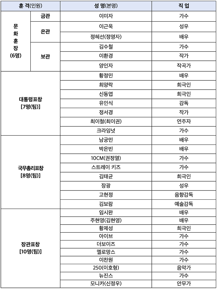 보관문화훈장은 ▴1979년에 데뷔, <못다 핀 꽃 한 송이>, <젊은 그대> 등 다수의 인기곡을 발표하고, 국악과 록을 접목시키는 등 다양하고 폭넓은 음악 활동을 해 온 가수 김수철 씨, ▴<야인시대>, <태조 왕건>, <용의 눈물> 등 대중의 큰 사랑을 받은 여러 편의 역사 드라마를 집필한 작가 이환경 씨, ▴<킬리만자로의 표범>, <사랑의 미로> 등 서정적인 가사로 당대 최고의 가수들과 협업하며 3천 곡 이상을 작사한 대한민국을 대표하는 작사가 양인자 씨가 받는다.