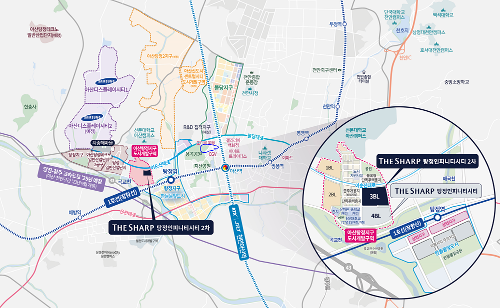 ‘더샵 탕정인피니티시티 2차’가 들어서는 아산탕정지구 도시개발구역은 갈산리, 매곡리 일원, 53만 6,900여㎡ 부지에 3, 4블록 더샵 브랜드 타운(2,354가구)을 포함한 약 4,300여 가구 규모의 주거지를 조성하고 학교, 녹지, 공공청사 등 입주민들을 위한 도시기반시설들이 건립될 예정이다. 특히 도시개발구역 남측에 보도교 신설이 계획돼 있어 탕정역 접근성이 더욱 향상될 것으로 보인다.