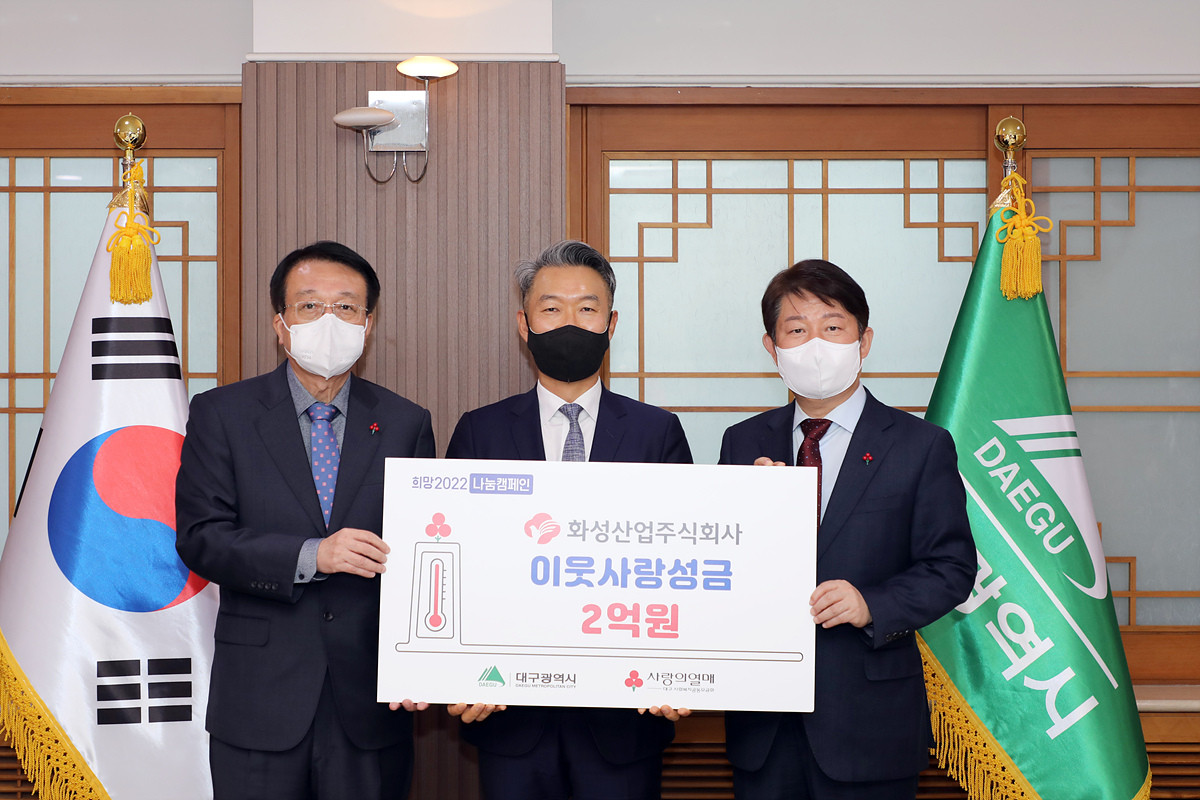 화성산업(주)은 13일(월) 시청별관에서 권영진 대구시장, 이종원 화성산업 대표이사 사장, 김수학 대구사회복지공동모금회장 및 관계자들이 참석한 가운데 이웃돕기 성금 2억원을 대구사회복지공동모금회에 전달하며 '희망2022나눔캠페인'에 동참했다.