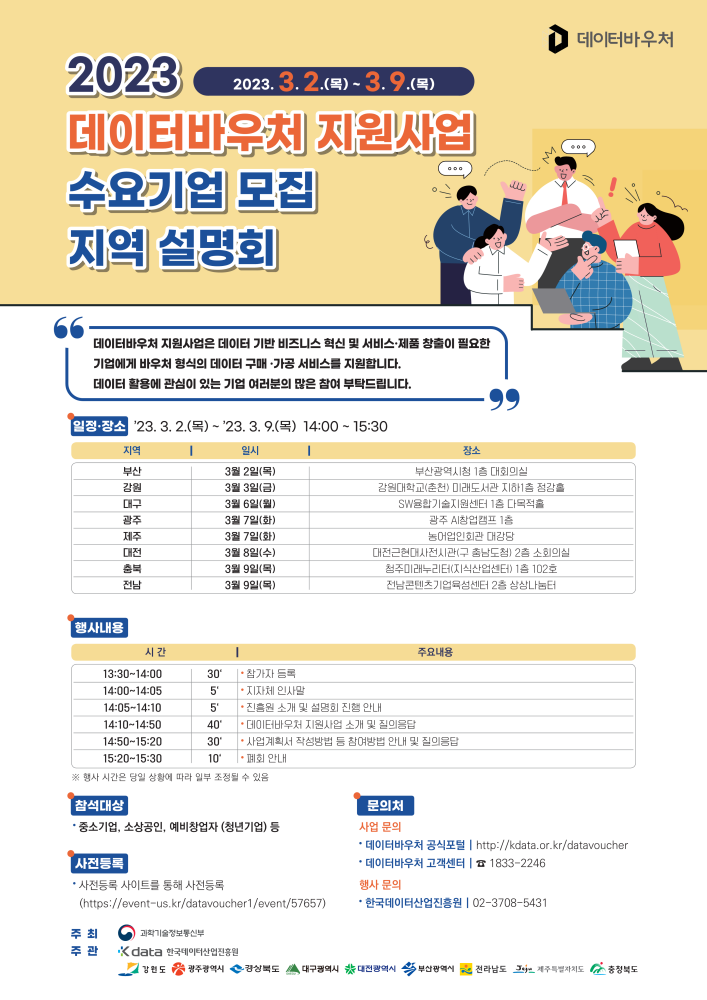 대구시는 과학기술정보통신부(한국데이터산업진흥원)와 함께 지역 중소기업·예비창업자 등을 대상으로 2023년 데이터바우처 지원사업 수요기업 모집 지역설명회를 오는 6일(월) 수성알파시티 SW융합기술지원센터에서 개최한다.