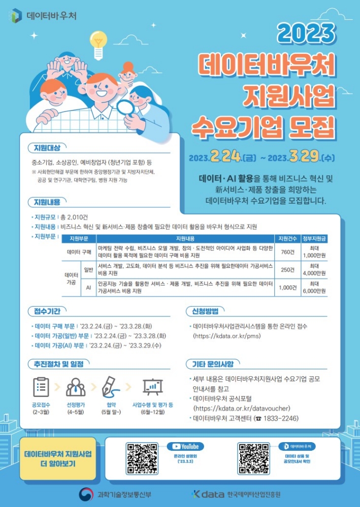 올해 데이터바우처 사업은 데이터 구매, 일반가공, AI가공 등 3개 분야에 걸쳐 총 894억 원을 투입해 2,010개 기업에 지원될 예정이다.