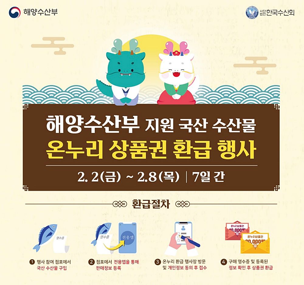 대구농수산물유통관리공사는 설 명절을 맞아 국내산 수산물 소비를 촉진하고 도매시장 활성화를 위해 수산물 구입 금액의 30%를 온누리상품권으로 환급(최대 2만 원)해 주는 행사를 시행한다.