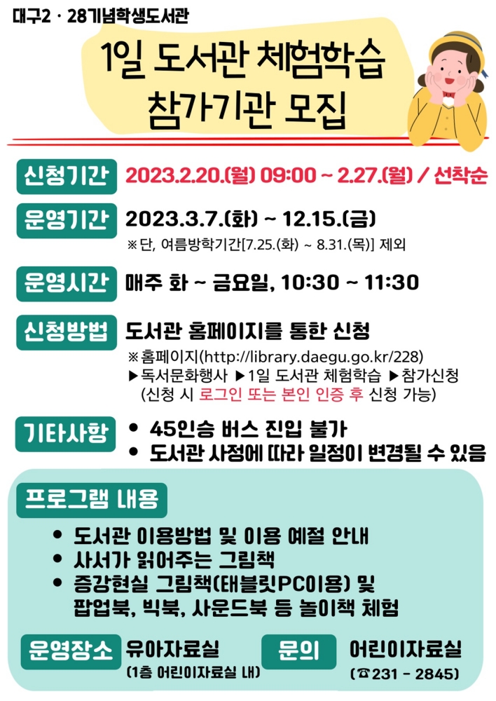 대구2‧28기념학생도서관은 취학 전 아동에게 도서관 이용 교육을 통한 올바른 독서습관 형성 및 책에 대한 친밀감을 높이고자 오는 2월 20일(월)부터 ‘1일 도서관 체험학습’ 참가 기관을 모집한다.