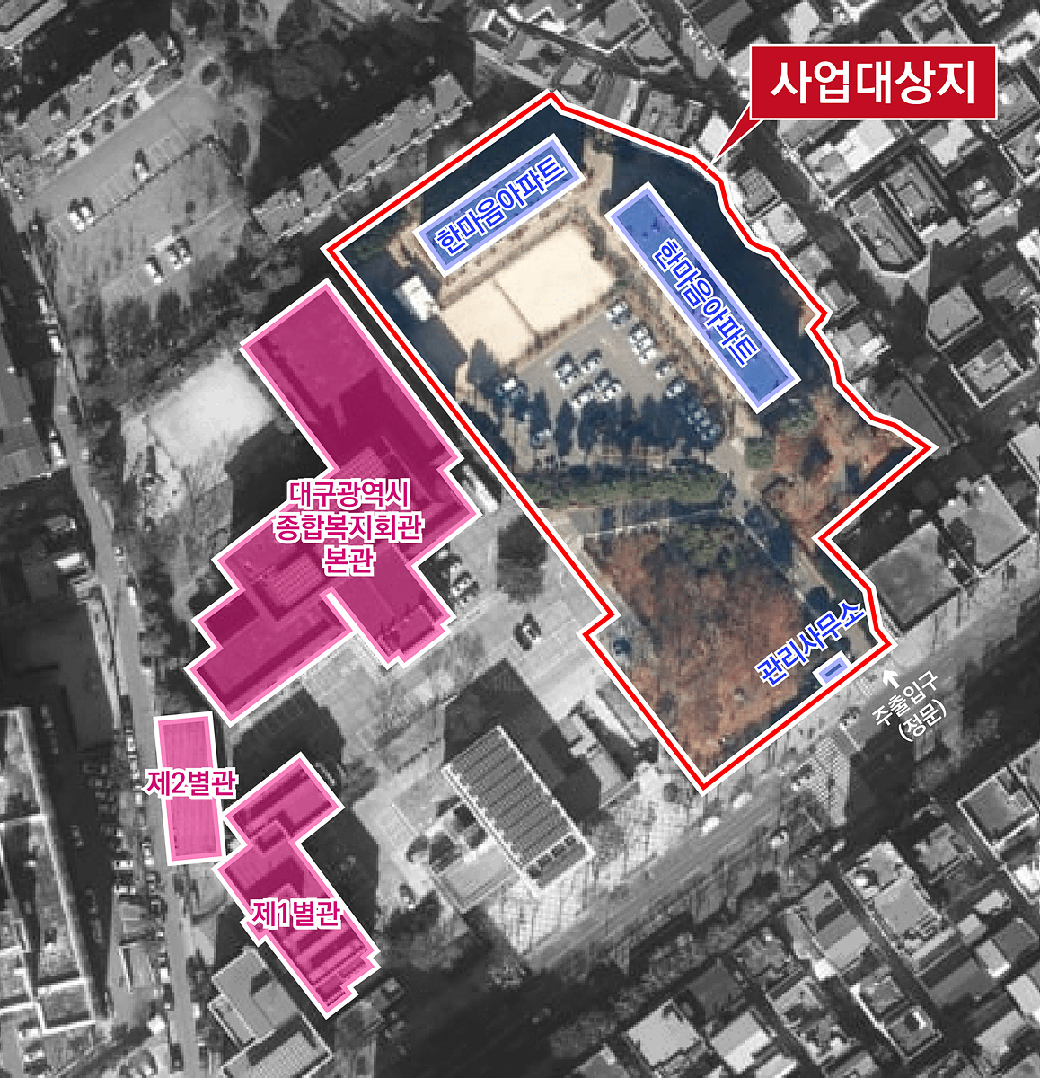 달서구 성당동 '한마음 어울림센터 조성' 사업은 코로나19로 인한 집단 자가격리 아파트인 한마음아파트 재건축 사업(기존 100호 철거 → 청년 행복주택 240호 신축)과 연계해 전국 최초로 주거재생특화형 재생사업*으로도 함께 선정됐으며 지역의 부정적 인식 전환, 노후 주거지역 정비, 시 정책사업 추진을 위한 공간 조성 및 지역주민 생활SOC 시설을 공급할 예정이다.