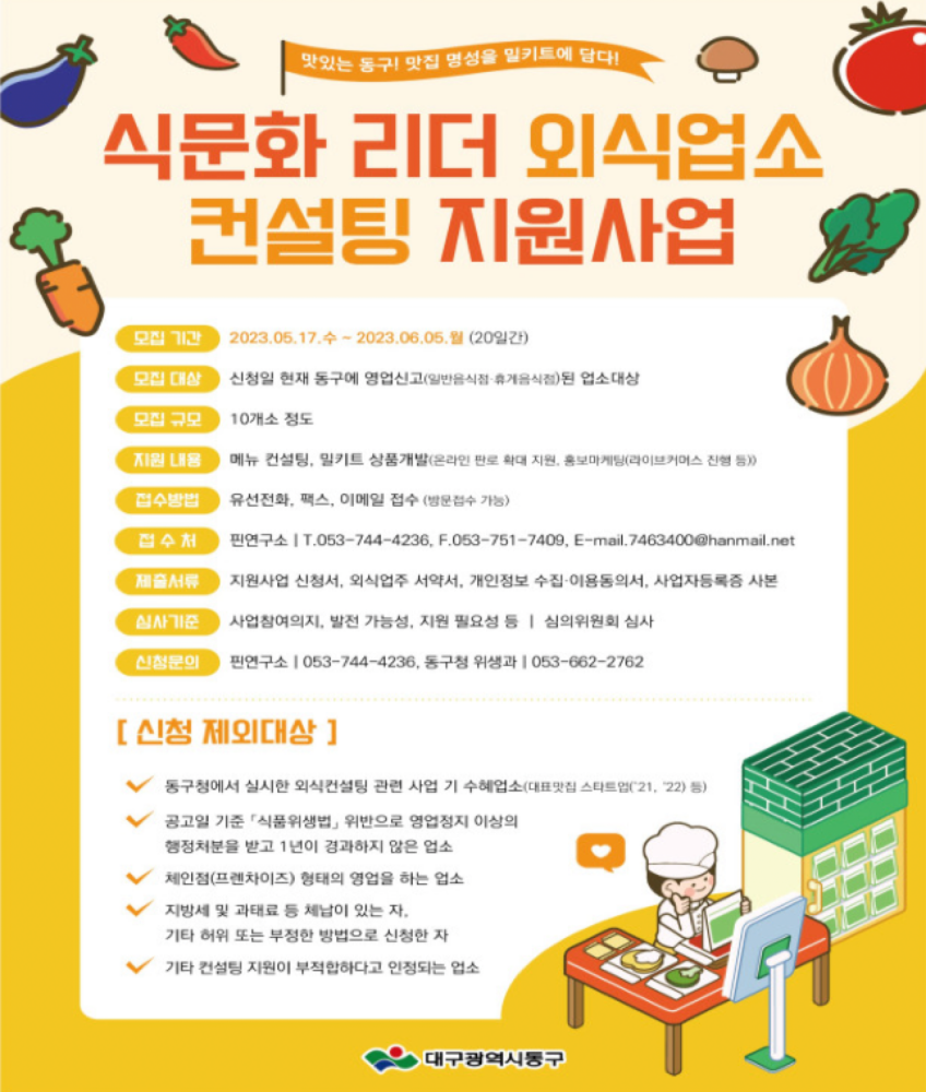 대구 동구청은 오는 6월 5일까지 ‘식문화 리더 외식업소 컨설팅 지원사업’에 참여할 외식업소 10개소를 모집한다.