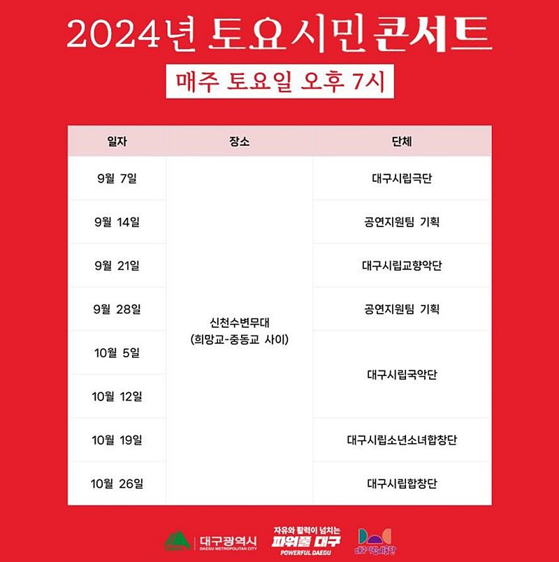 대구광역시는 시민에게 즐거움을 선사하고 문화와 예술로 도심 곳곳에 활력을 부여하기 위한 대구시립예술단 ‘토요시민콘서트’와 ‘ 2024 동성로 청년버스킹’의 하반기 공연을 9월 6일(금)부터 재개한다.