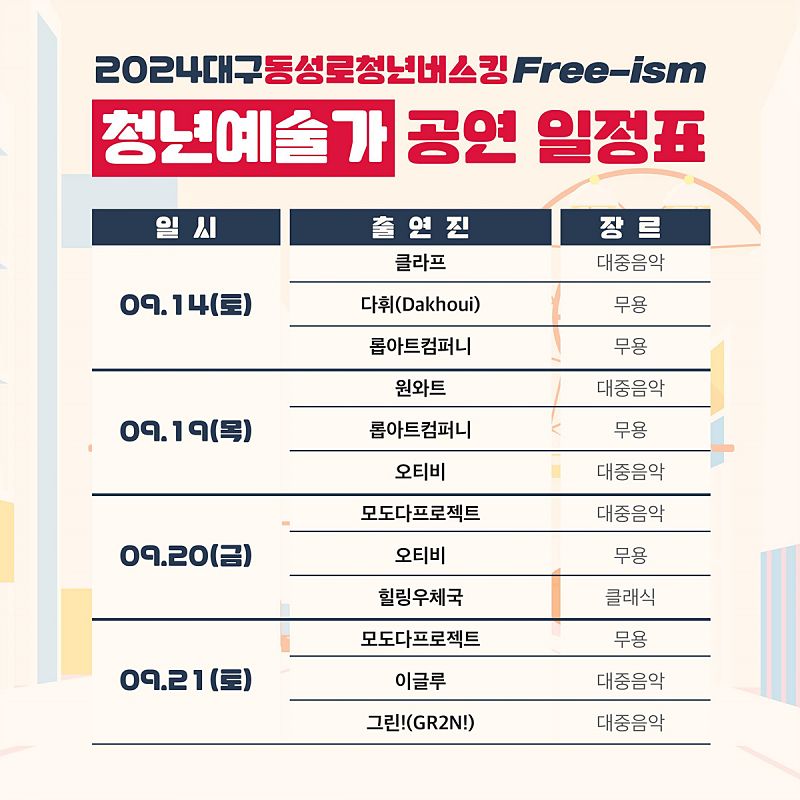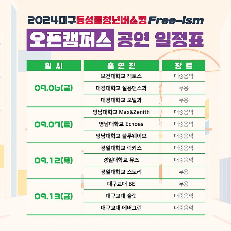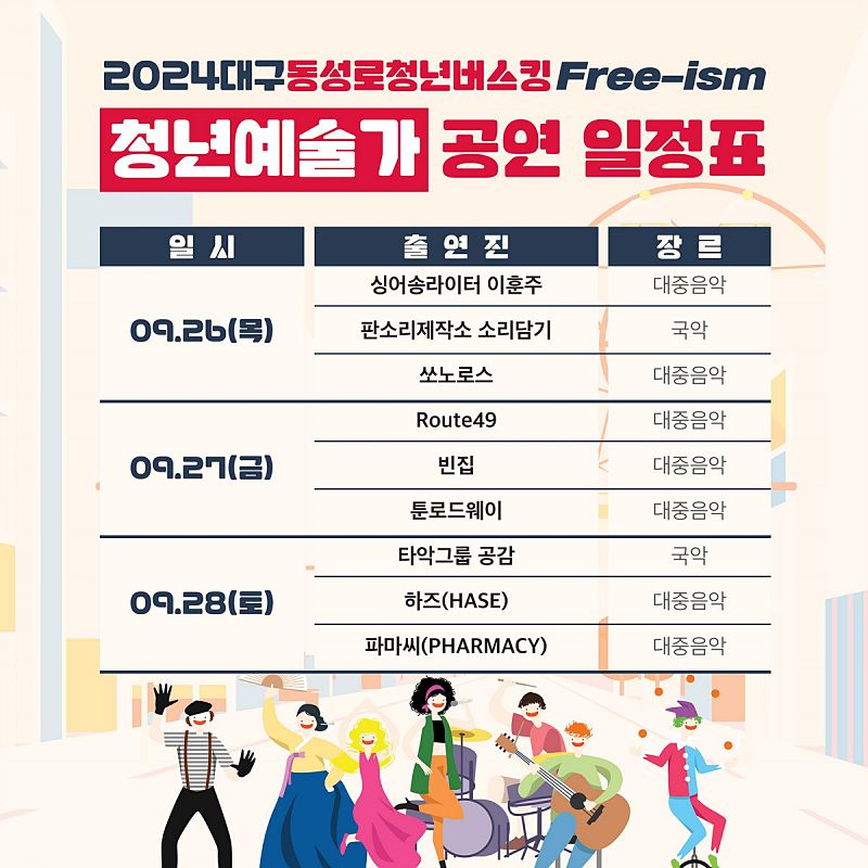배정식 대구광역시 문화체육관광국장은 “동성로와 신천이 시민과 청년이 모여드는 지역 대표 공연공간으로 활기가 더해지고 있다”며, “도심 곳곳이 문화예술로 활력이 넘쳐나도록 지속적인 시민 여러분의 뜨거운 관심과 관람을 부탁드린다”고 말했다.