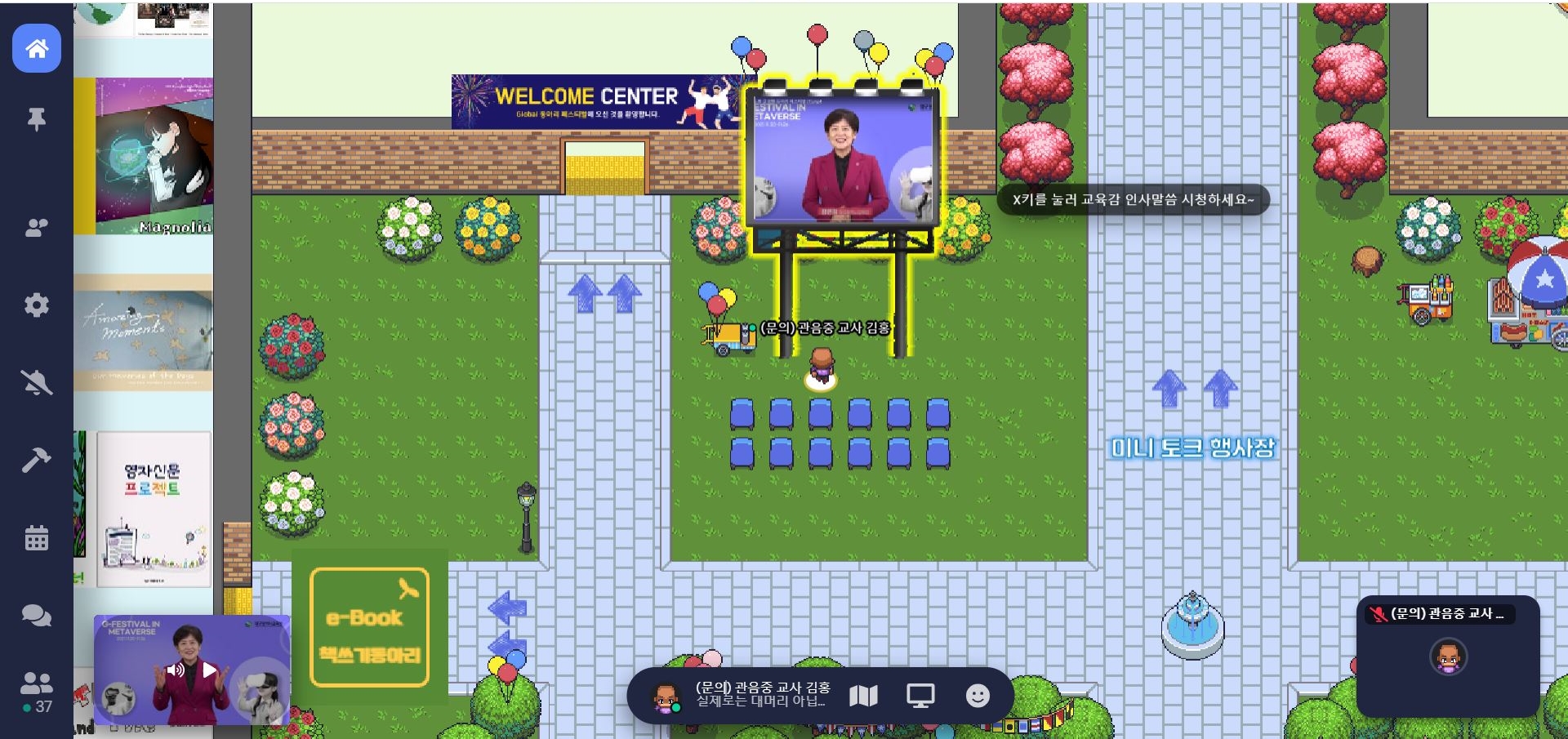 개더타운: 메타버스 플랫폼의 한 종류로 사용자가 만든 아바타가 가상세계를 돌아다니면 실시간 화상채팅 및 콘텐츠를 통한 정보를 전달하거나 학습이 가능함(비슷한 예로 네이버 제페토, 로블록스 등이 있음)