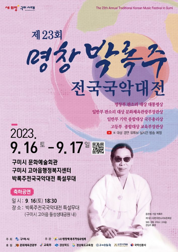 구미시는 16일부터 2일간 고아읍 행정복지센터 등에서 (사)명창박록주기념사업회 주관으로 제23회 명창 박록주 전국국악대전을 개최한다.