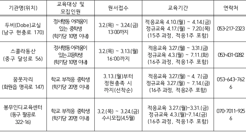모집대상은 학교생활 부적응 및 정서행동 어려움을 겪고 있는 대구 지역 중·고등학생이며 중학생은 3월 24일(금)까지, 고등학생은 3월 13일(월)까지 희망하는 위탁교육기관에 원서를 접수하면 된다.
