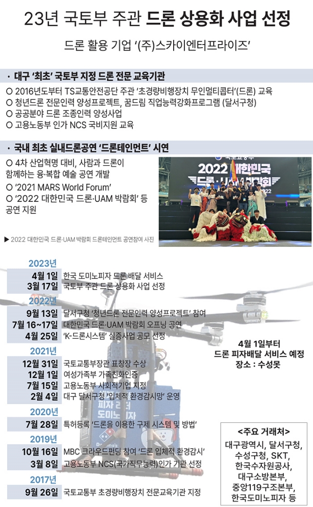 한편, (주)스카이엔터프라이즈는 국토부가 지정한 드론교육 및 항공서비스를 제공하는 대구 달서구 소재 기업으로, 한국수자원공사, 대구소방본부 등과 협업해 실시간 영상중계 항공감시서비스를 다년간 진행하고 있다. 최근에는 수성못 일원에서 드론으로 피자를 배달 받는 이색적인 경험을 시민들에게 제공하고 있다.