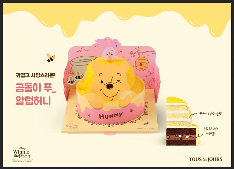 먼저 ‘곰돌이 푸_알럽허니’는 꿀이 너무 좋아 꿀단지 속에 퐁당 빠져버린 ‘곰돌이 푸’의 모습을 귀엽고 사랑스러운 비주얼로 표현한 2단 케이크다. 특히 ‘곰돌이 푸’ 캐릭터의 노란 색감을 담은 비주얼과 입체적인 패키지 디자인의 디테일이 눈길을 끈다.