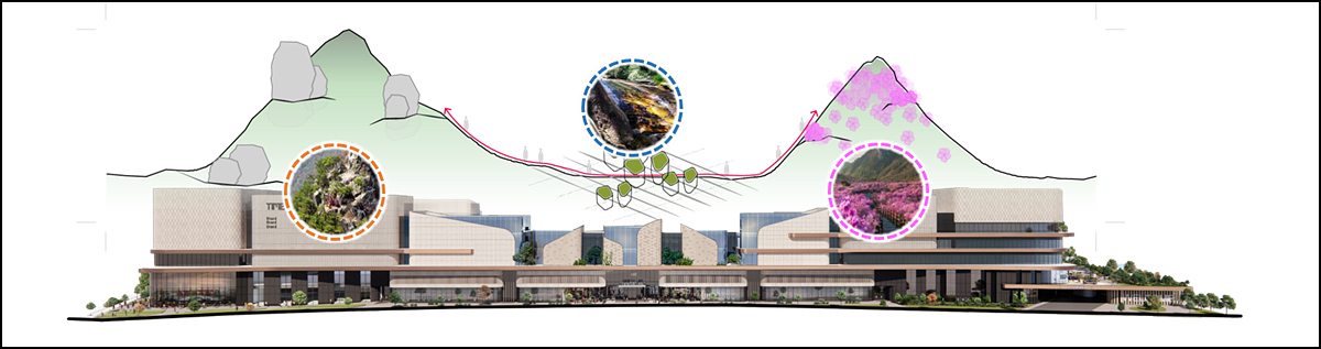 이번 조감도는 팔공산과 비슬산 등 대구의 자연경관을 담아내 눈길을 끈다. 최상층부 독특한 외관은 대구지역 산지의 다채로운 굴곡을 표현하면서도 ‘팔공산 기암괴석’의 신비로운 모습을 형상화했으며, 실내와 실외를 연계하는 광장은 ‘수태골 계곡’을 모티브로 전국 어디에서도 볼 수 없는 독특한 형태로 구현할 계획이다. 더불어 다양하게 구축되는 이벤트 공간은 ‘비슬산 참꽃 동산’에서 힌트를 얻었다.