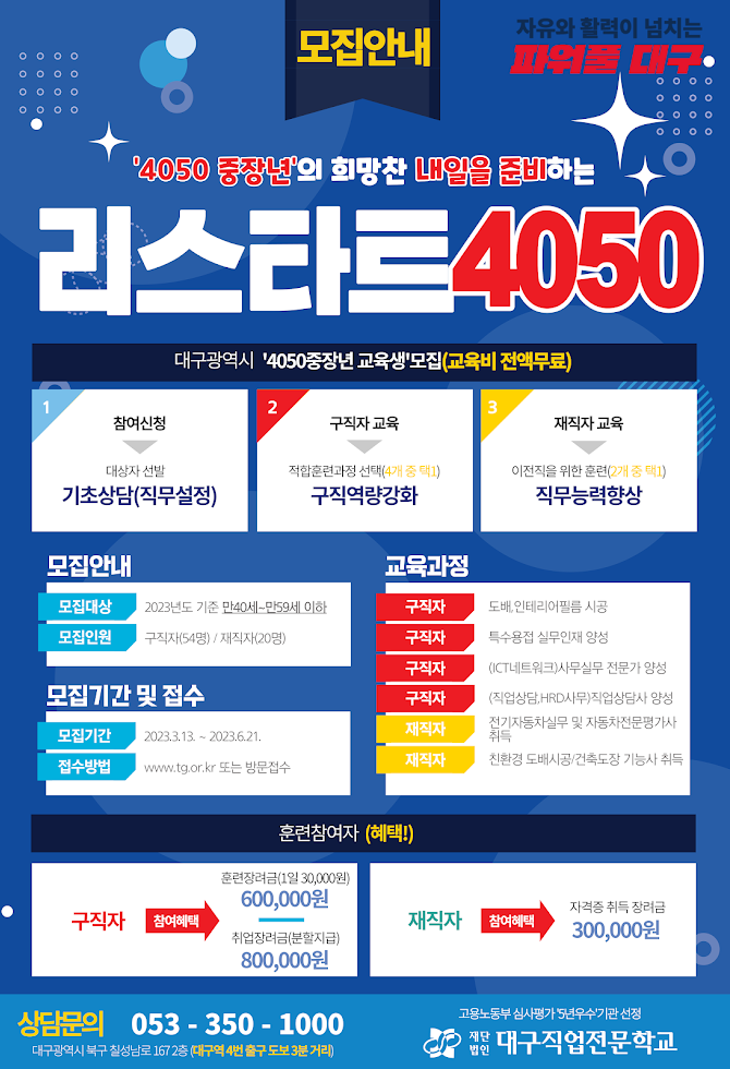 대구시가 실직 위기 중장년에게 안정적인 취업 기회를 제공하기 위해 ‘①개인별 진단·직업상담, ②노동시장 맞춤형 직업훈련, ③취업 연계 후 정착을 위한 사후 관리’까지 일괄 지원하는 ‘리스타트 4050 채용 연계 일자리 지원사업’을 펼친다.