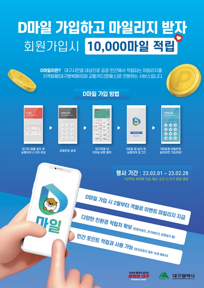 대구시는 2월 1일(수) 09시부터 마일리지 통합 플랫폼인 ‘D마일’앱에 신규 가입하는 회원 400명에게 10,000 마일리지를 지급한다.